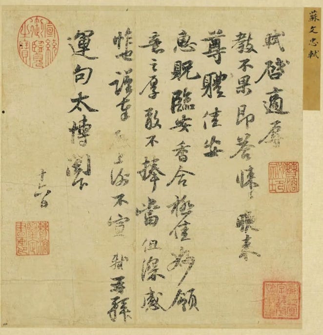 但如果只把它看成“二王遗风”,就低估了苏轼的创造。与同一时期的黄庭坚、米芾相比,苏字少了几分刻意求奇,多了几分出于性情的自然。黄庭坚爱在结构上做大幅度扭转,米芾则在用笔上追求险劲,苏轼在这封信中所展现的,是一种被压抑住的幽默感和轻快感:字形偶尔略带夸张,却从不抢戏,始终服务于整段语气的起伏。